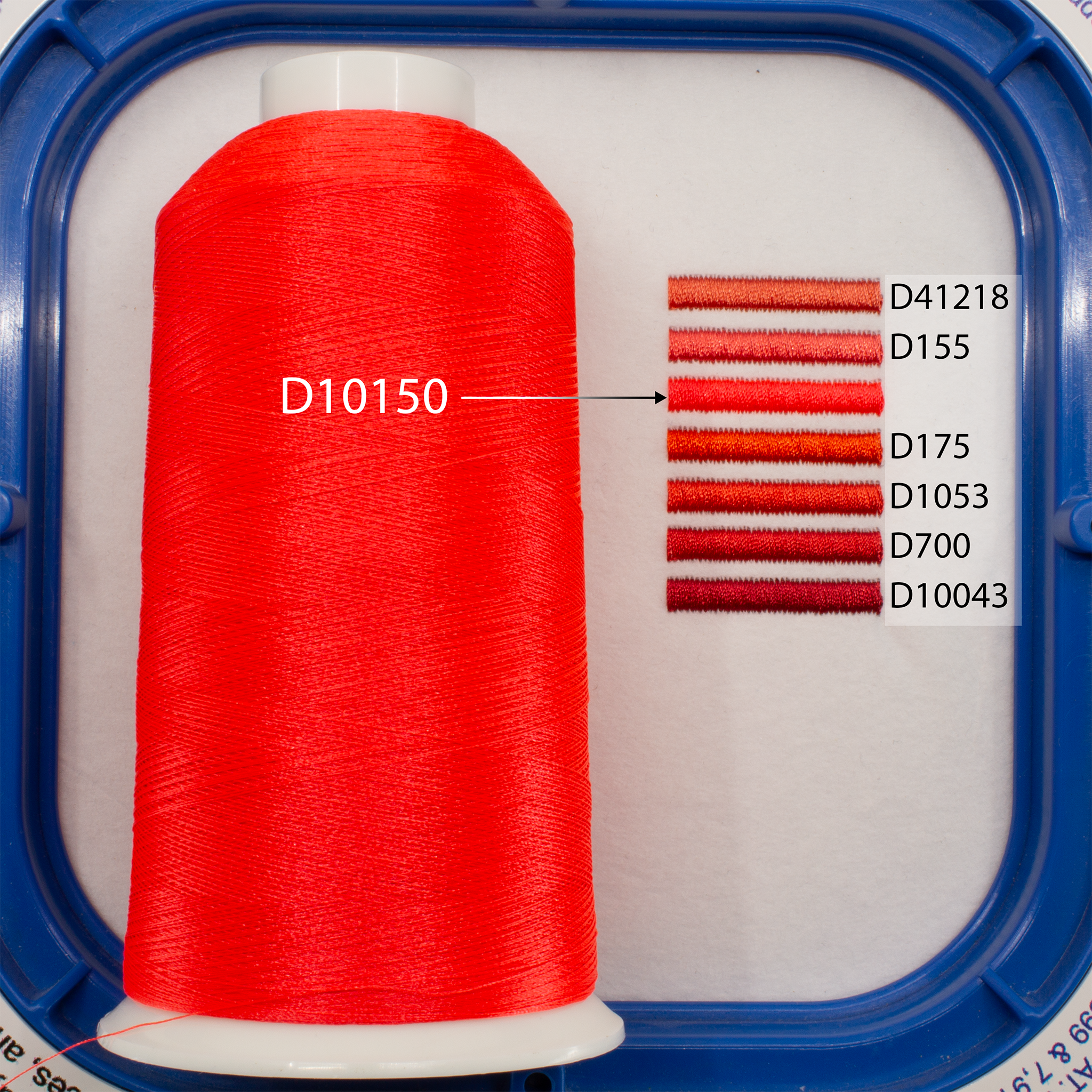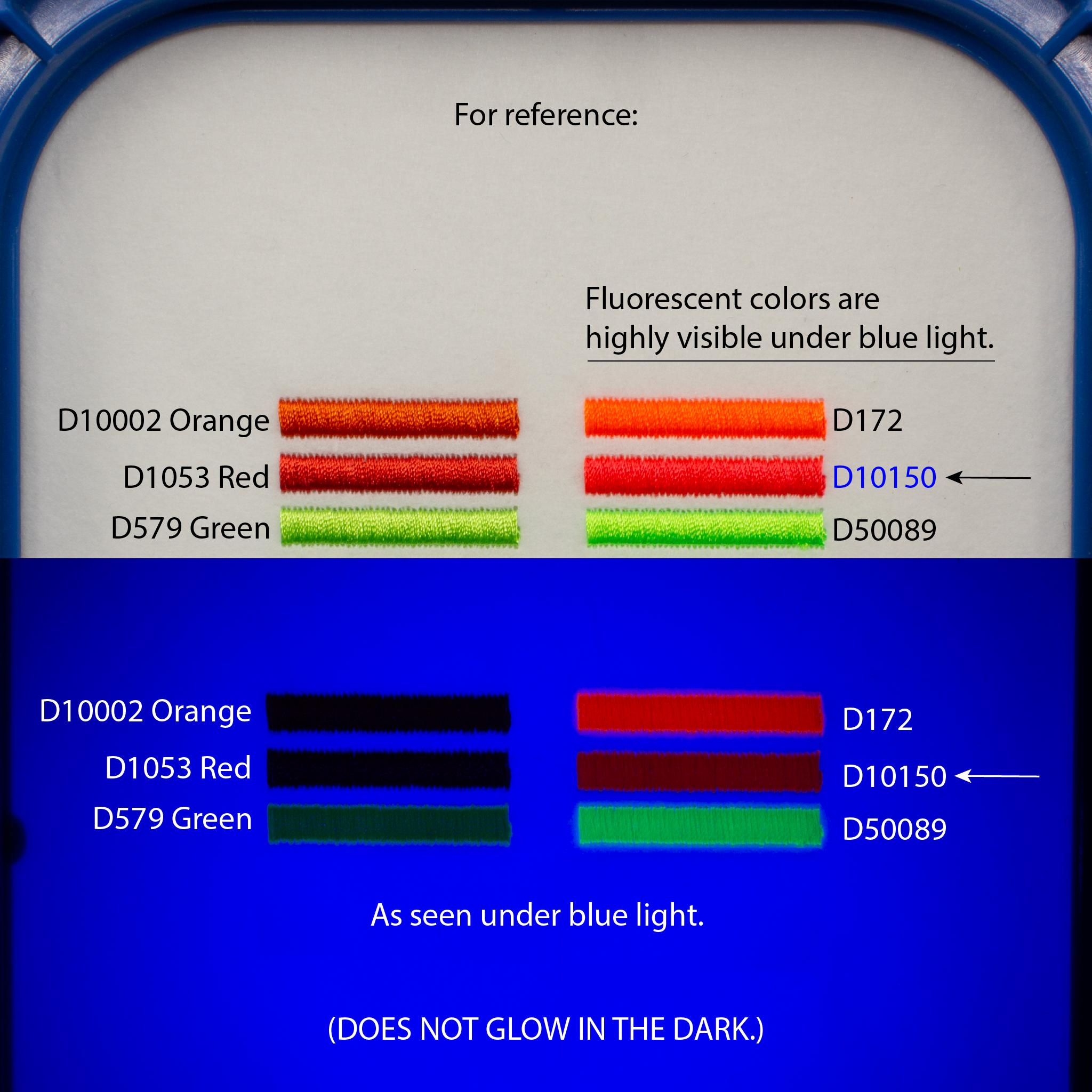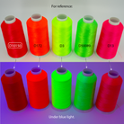 This bright orange-red thread has fluorescent characteristics. While it does not glow very brightly under blue light, is does display a visibly red color.