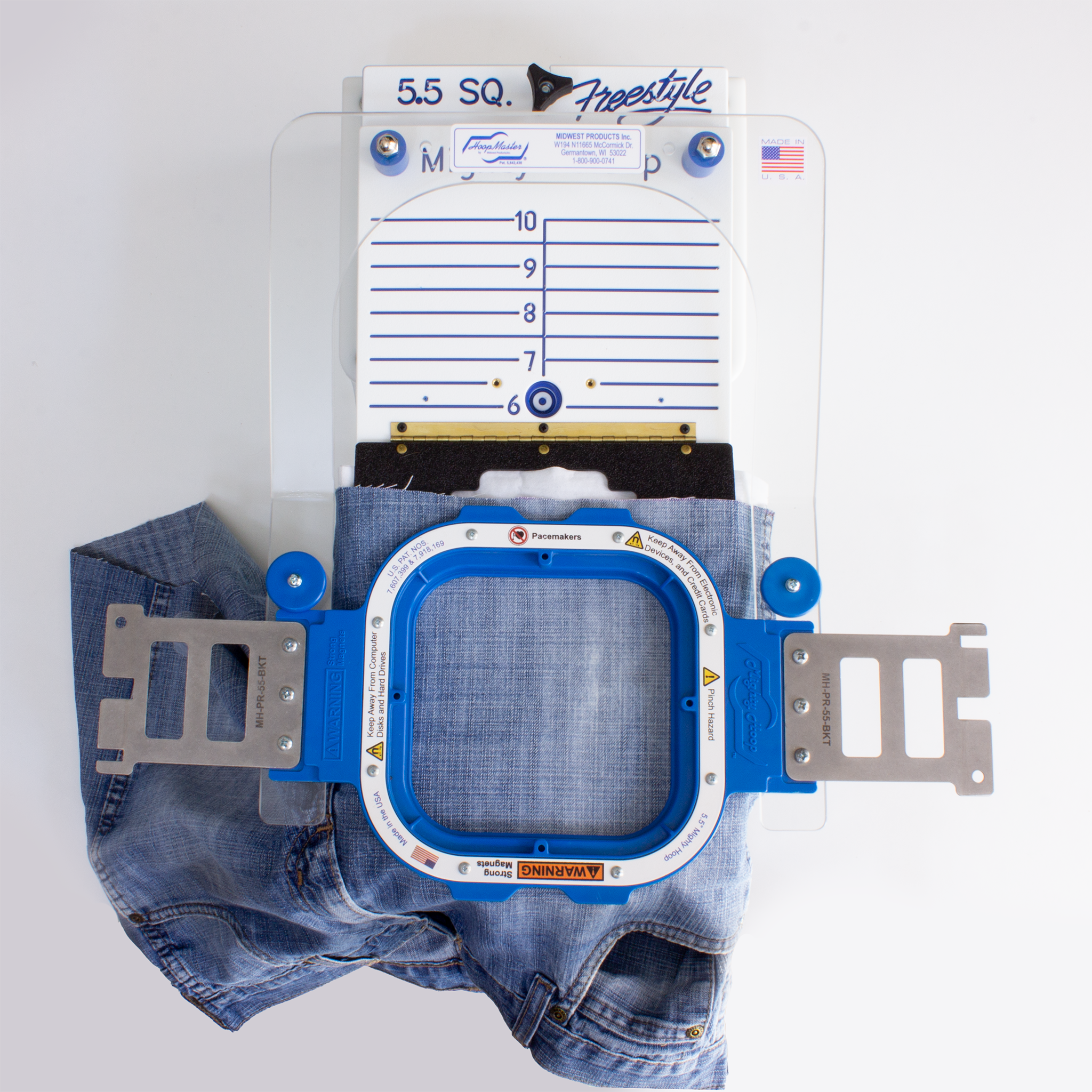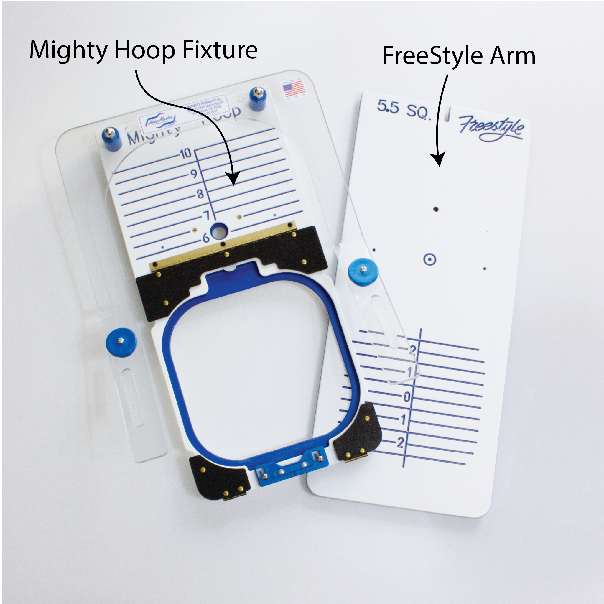 The adjustable fixtures hold the bottom ring of Mighty Hoops securely in place. Use the black stabilizer clamps to keep the stabilizer from moving during the hooping process.