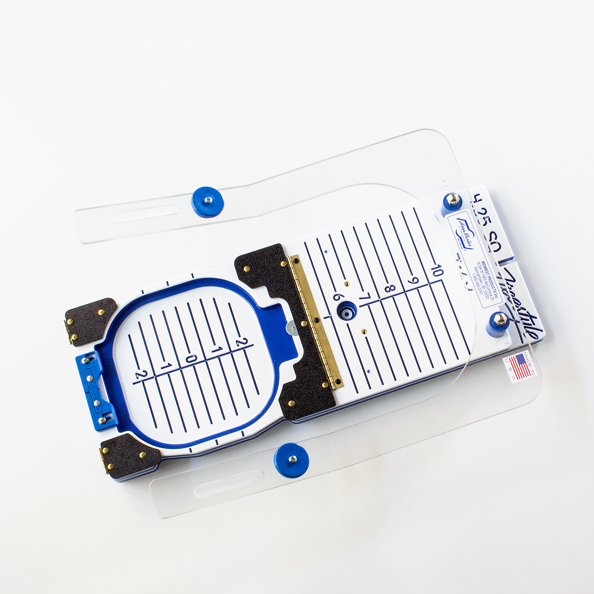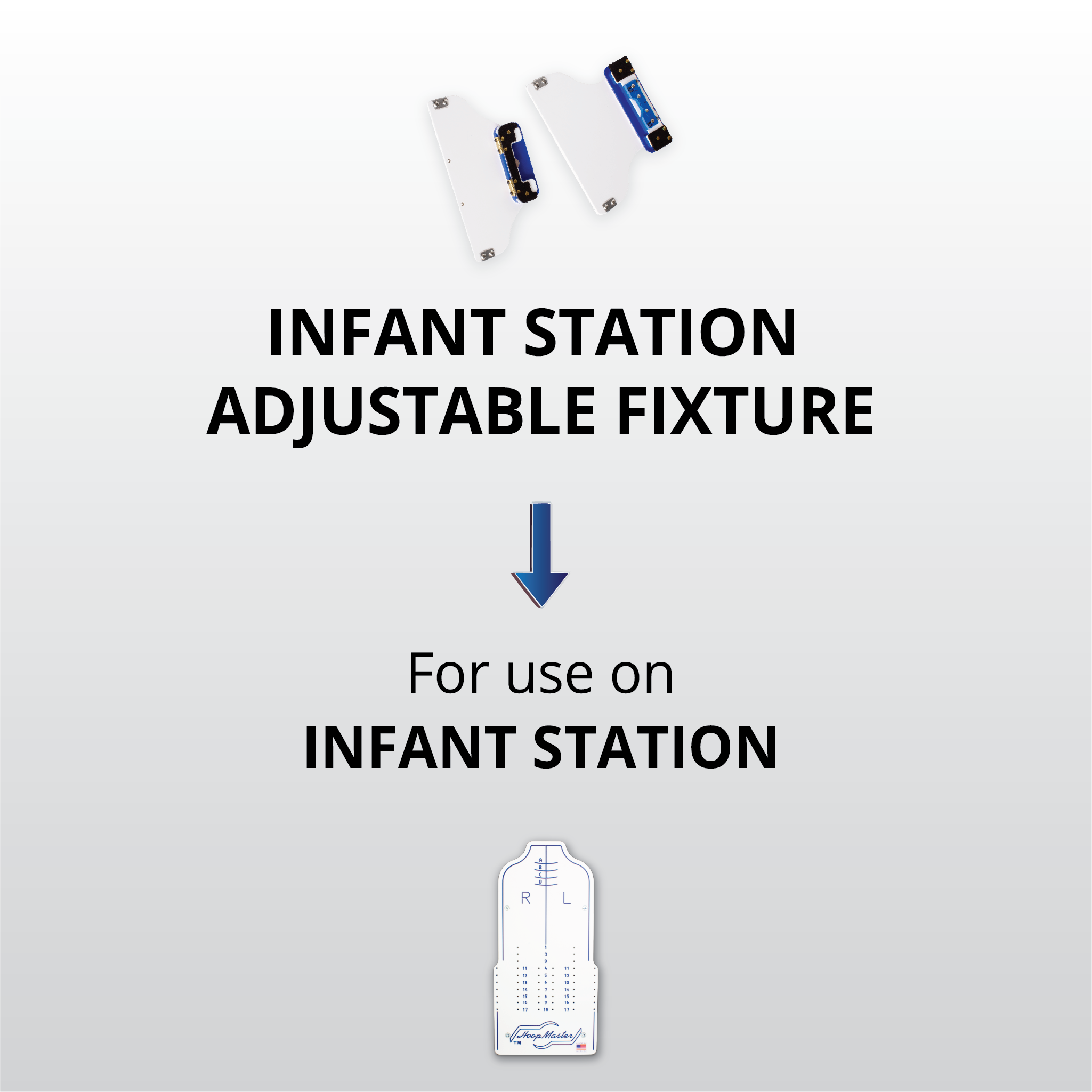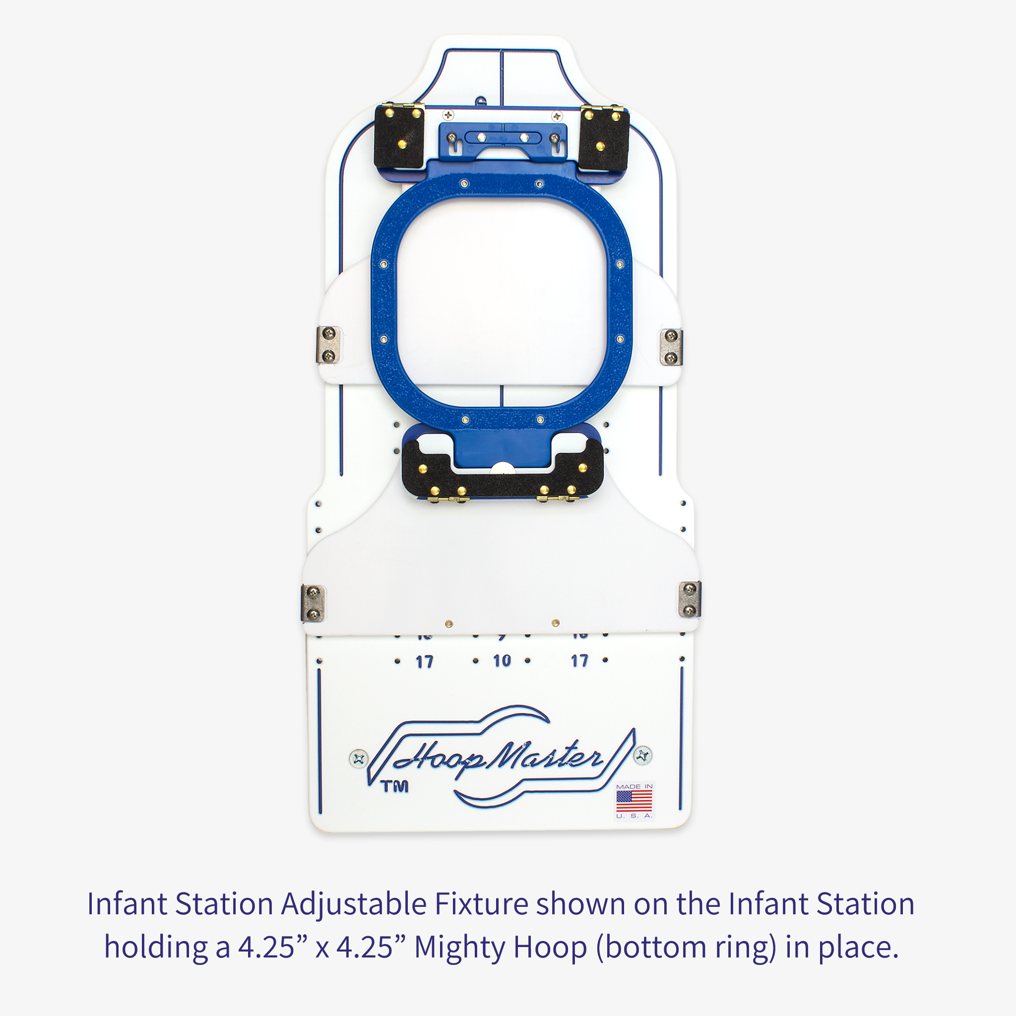 Use the Infant Station Adjustable Fixture to hold Mighty Hoops from 4.25" up to 10" x 10" on the Infant Station.