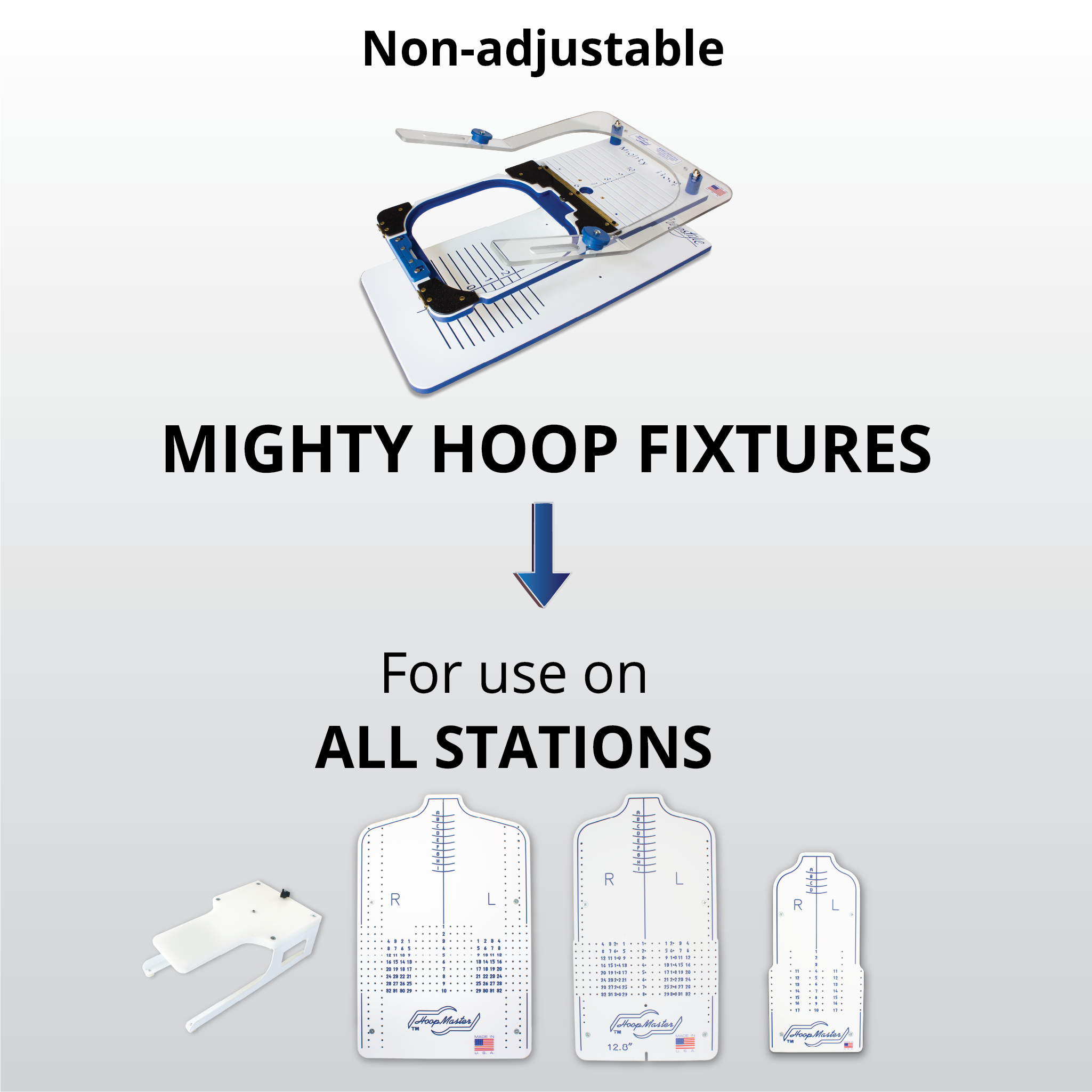 - Each HoopMaster hooping station has its own dedicated adjustable fixture.